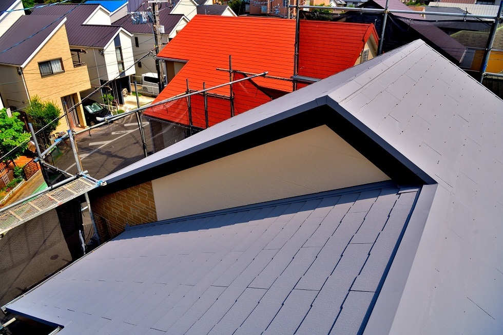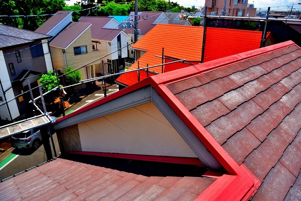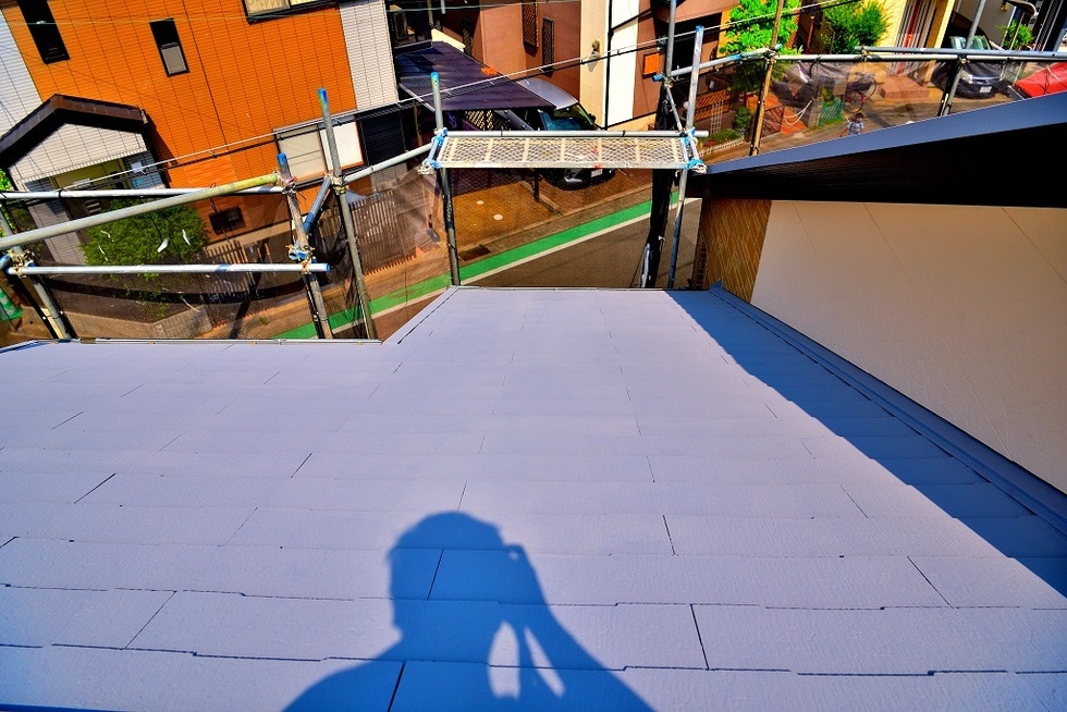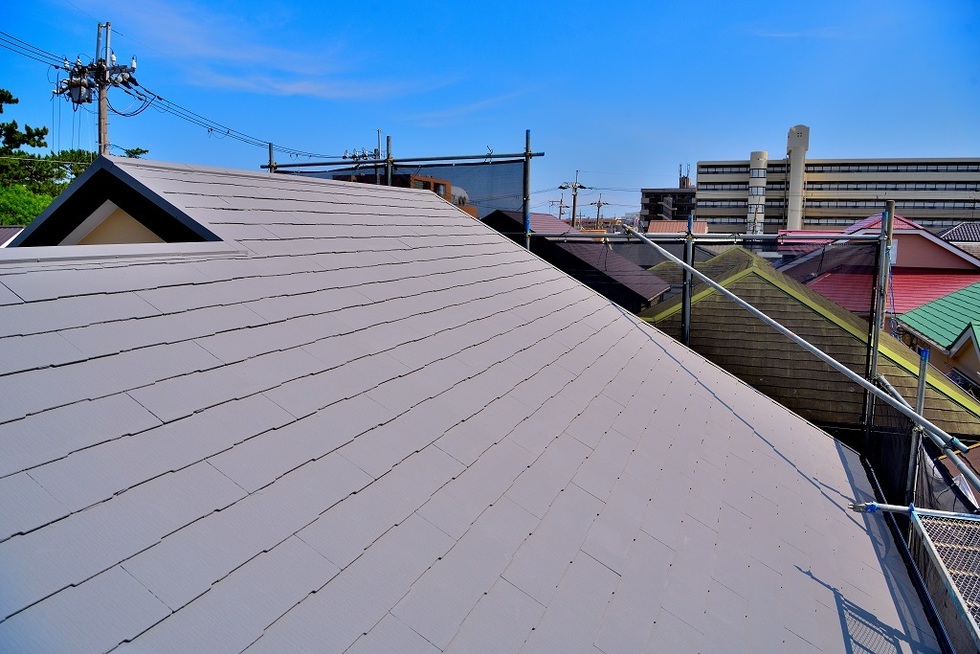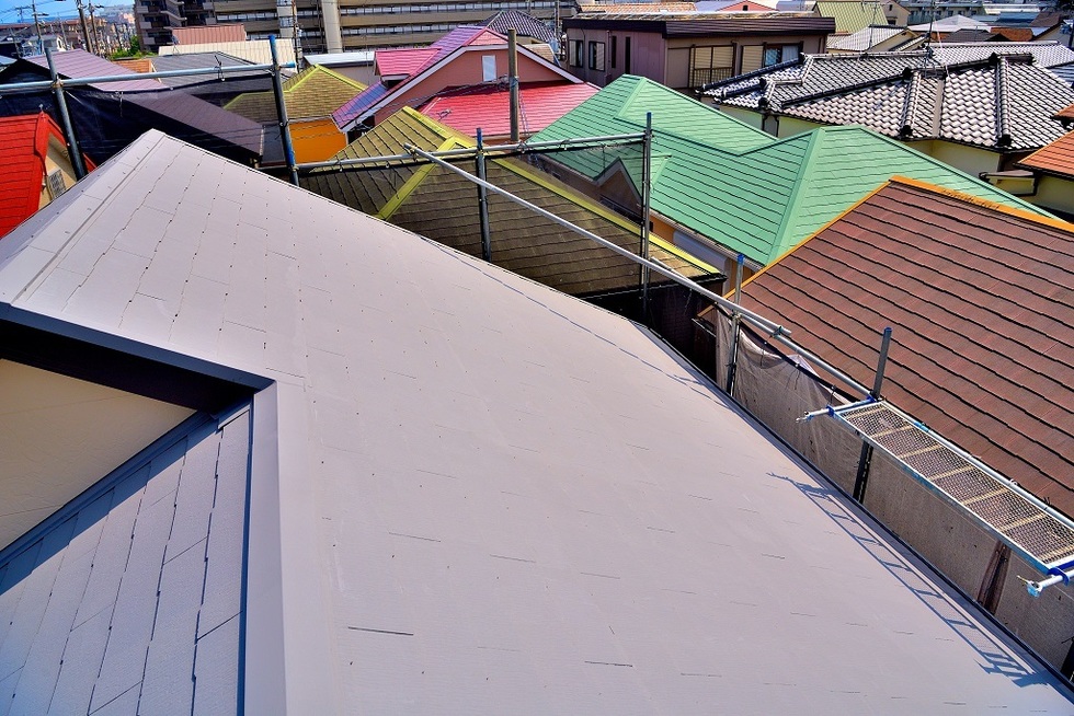 寝屋川市で2階戸建て木造住宅のカラーベスト屋根塗装工事の施工事例です。