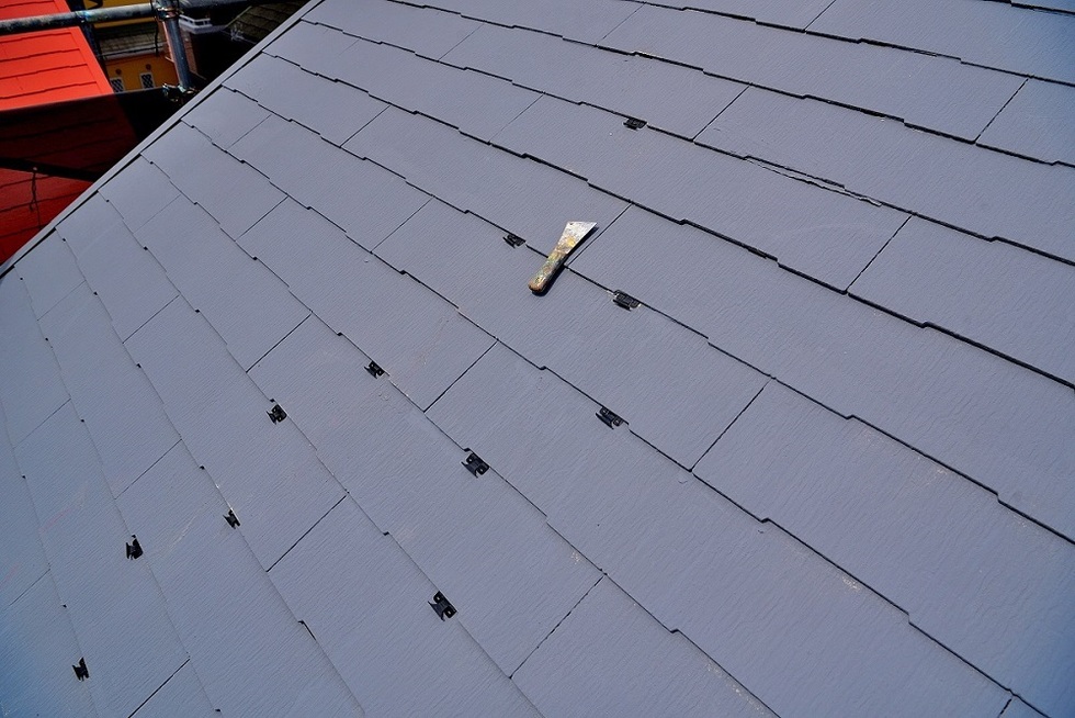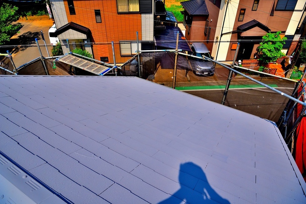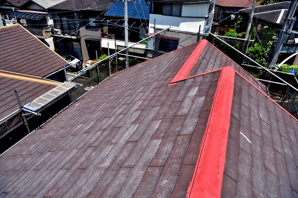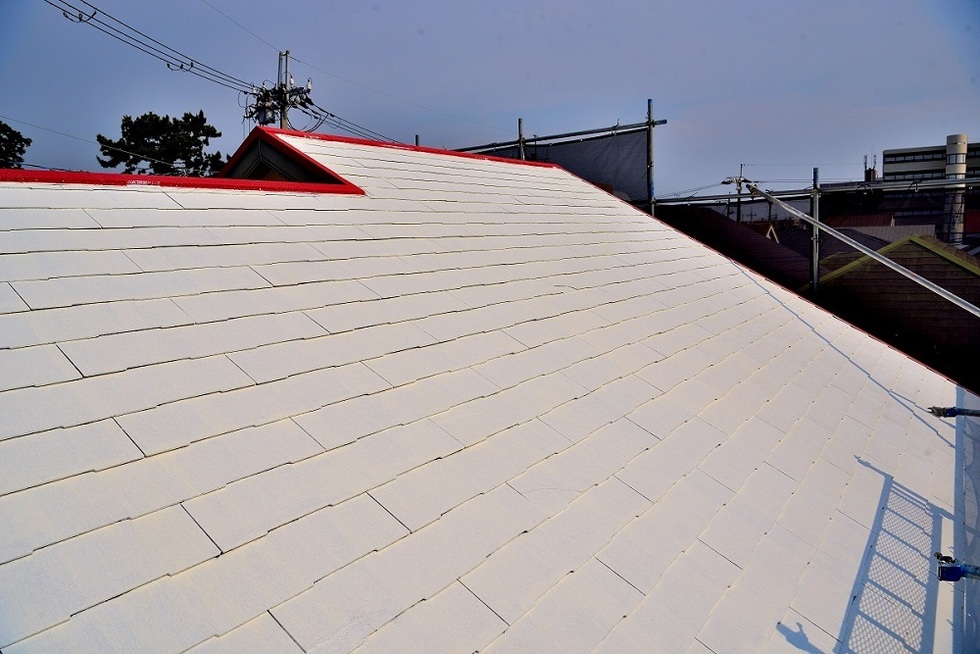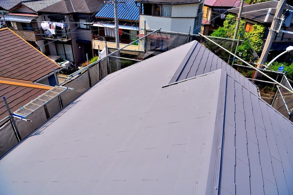 寝屋川市で2階戸建て木造住宅のカラーベスト屋根塗装工事の施工事例です。
