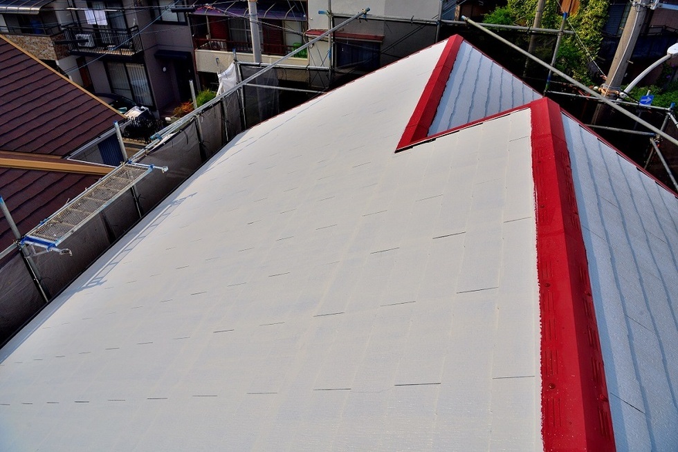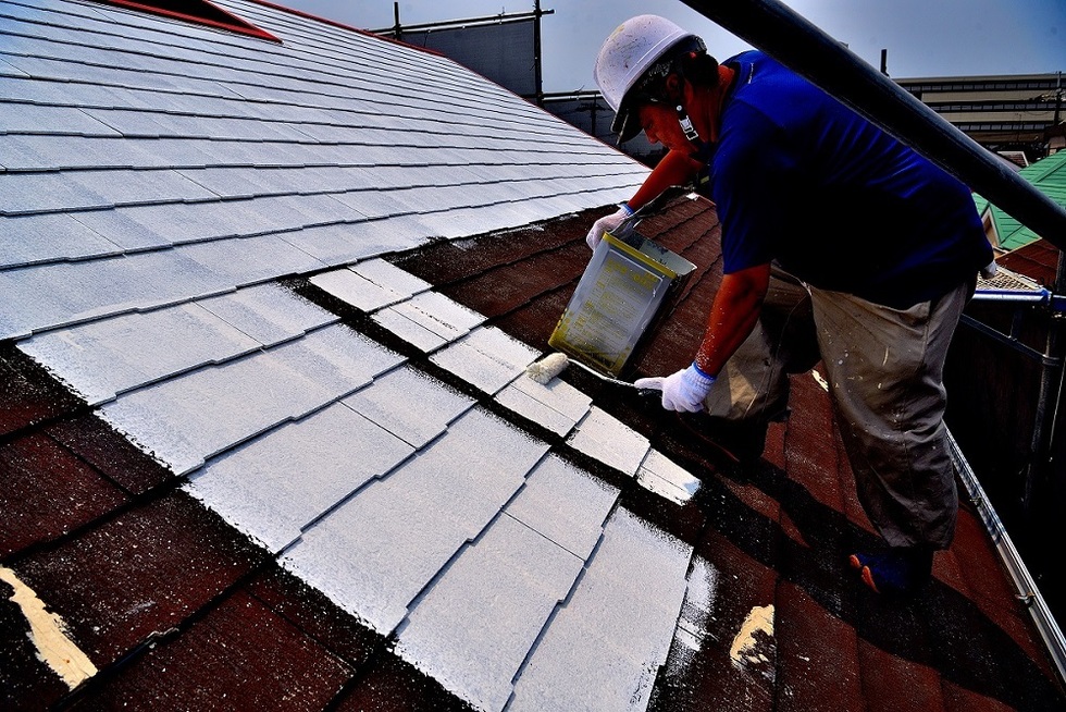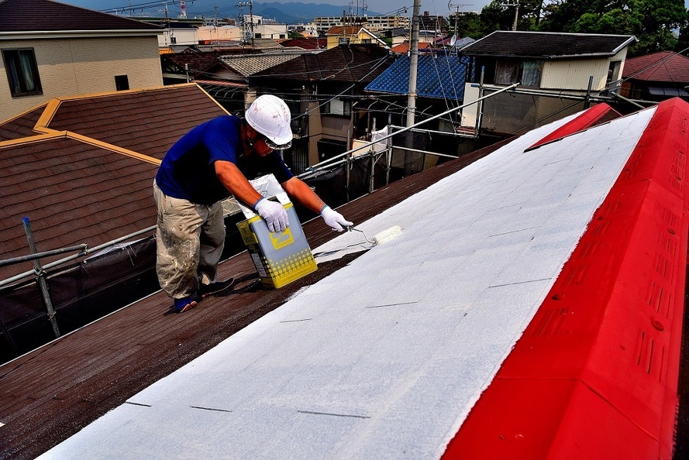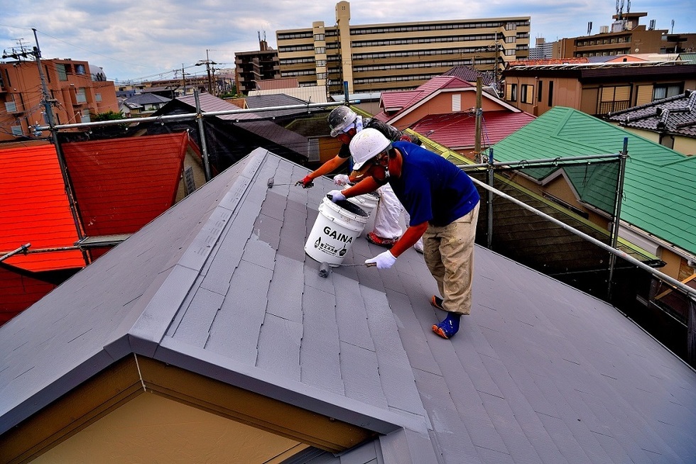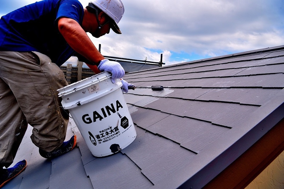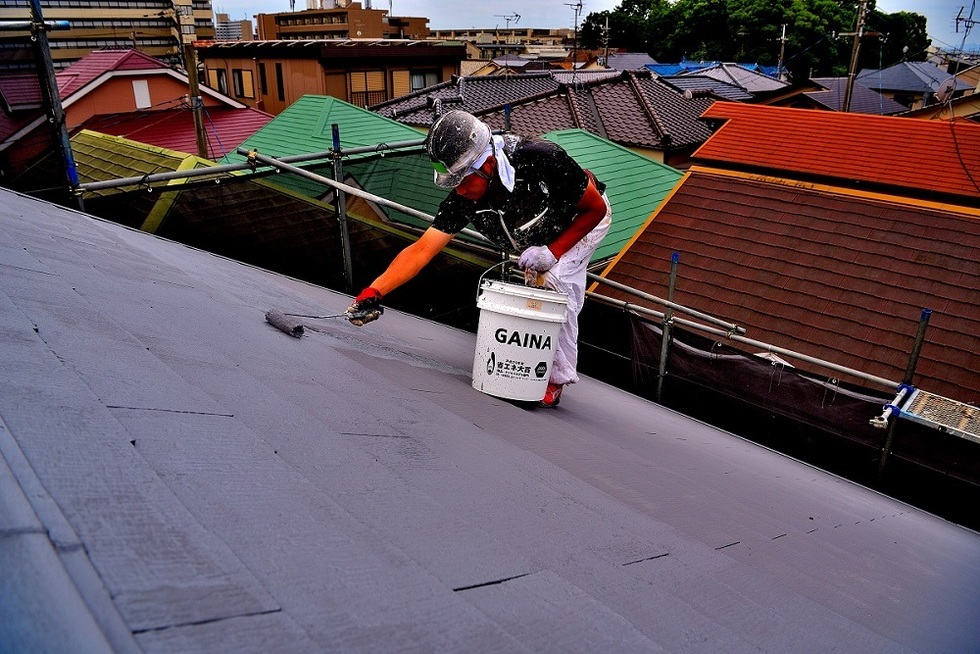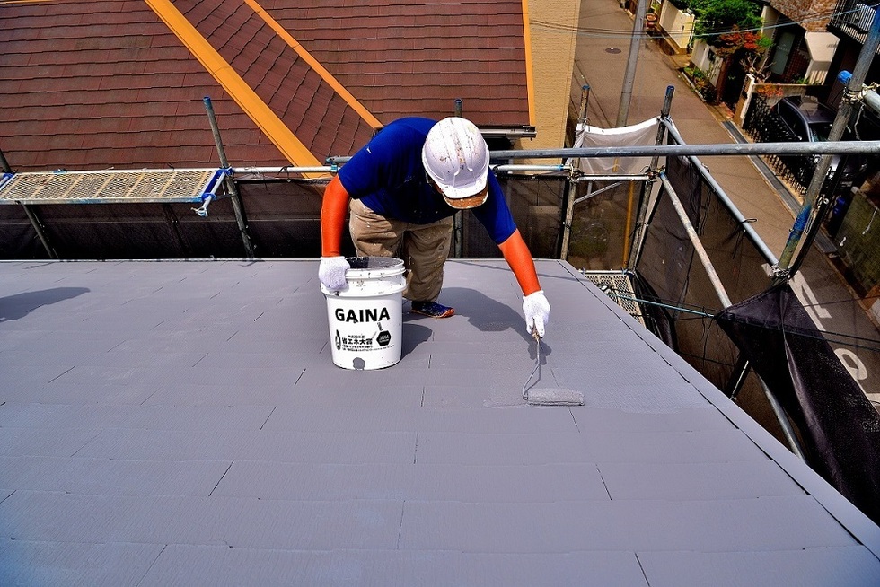 屋根の中塗り・上塗りには、日進産業の遮熱・断熱「ガイナ」を塗装しています。