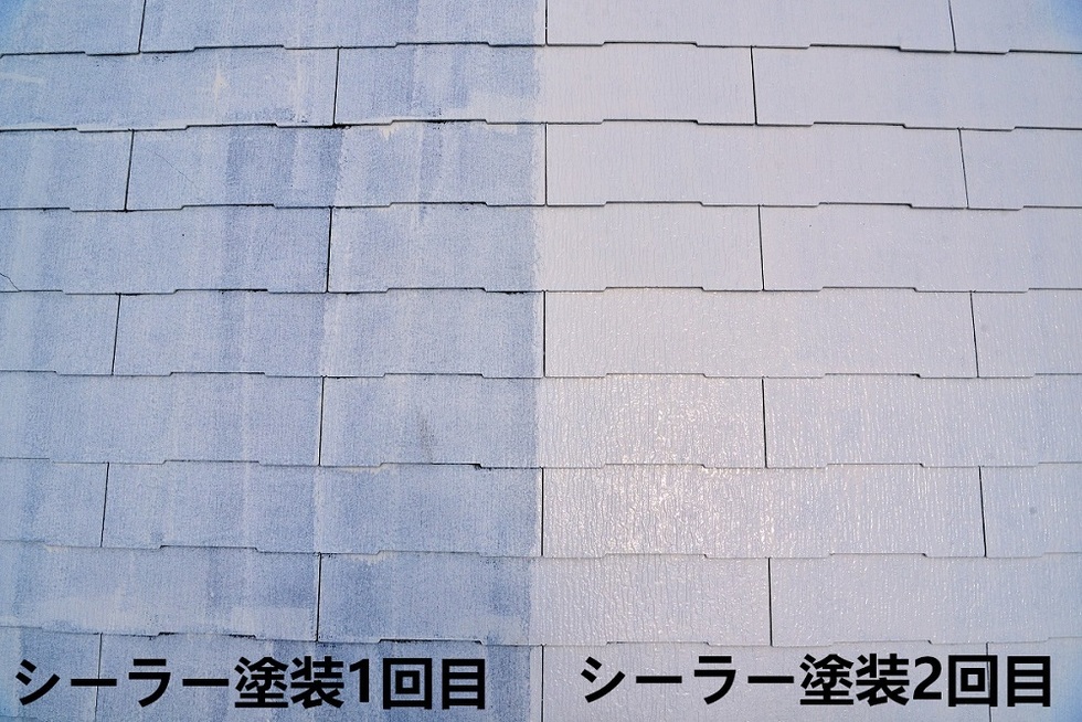 カラーベストは吸水性が高く経年劣化した屋根の場合、一度のシーラー塗装では素地にシーラーが吸い込まれ表面にほとんど残らない為早期の塗膜剥離や、上塗り塗料も素地に染み込むため、色褪せのトラブルに繋がり場合があります。