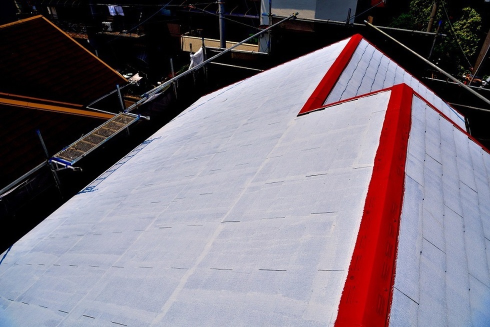 カラーベストの棟やケラバ、壁際などは全て金属製の水切り板金で処理されていいる為、上塗り塗料との密着性や腐食防止で錆止め塗料を塗装します。