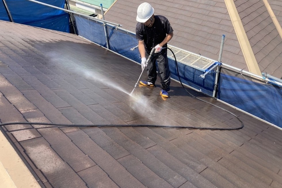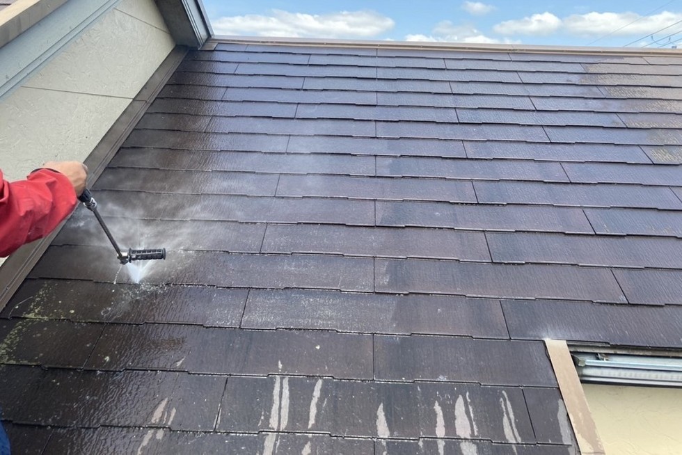 屋根の高圧洗浄は、出来るだけ丁寧に脆弱な旧塗膜やコケ、カビなどを綺麗に洗い流すことが重要で、又、洗浄時に軒樋やベランダテラスのアクリル板も一緒に洗浄します。